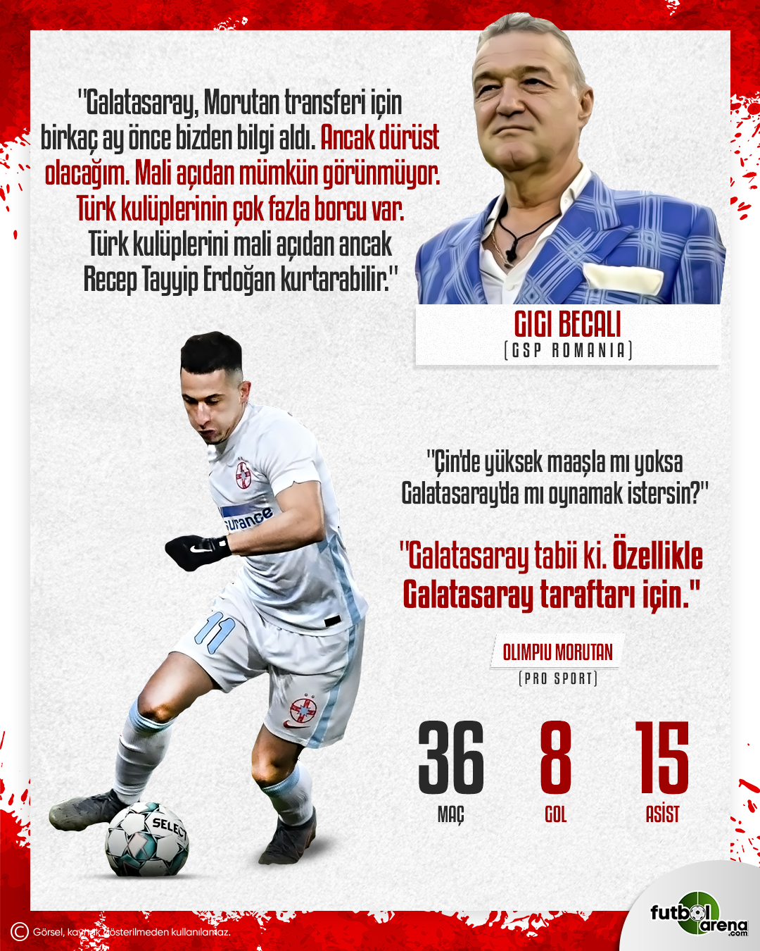 Fcsb'nin sahibi gigi becali, olimpiu morutan'ın transferi için galatasaray'la anlaştığını açıkladı. Galatasaray rumen 10 numara morutan için yeni bir teklif yapmaya hazırlanıyor. Galatasaray, uzun süredir gündeminde yer alan olimpiu morutan'ın işini bitirdi. Olimpiu morutan'ın galatasaray'a transferine adeta ramak kaldı. Fcsb'nin sahibi gigi becali, rumen basınına yaptığı açıklamada morutan yüzde 99 galatasaray'da diyerek transferin neredeyse bittiğini açıkladı.